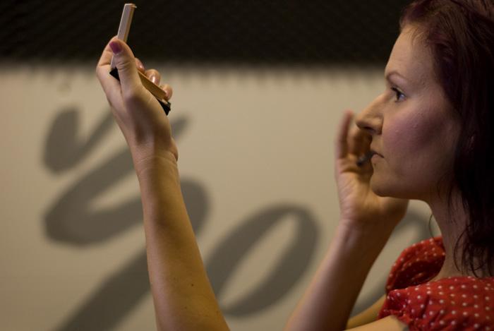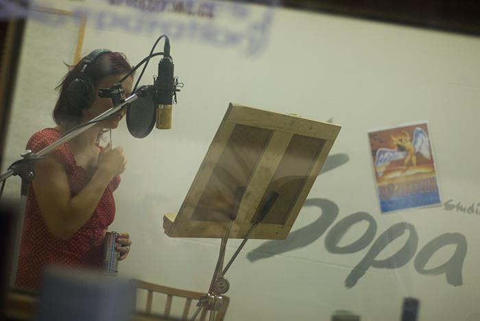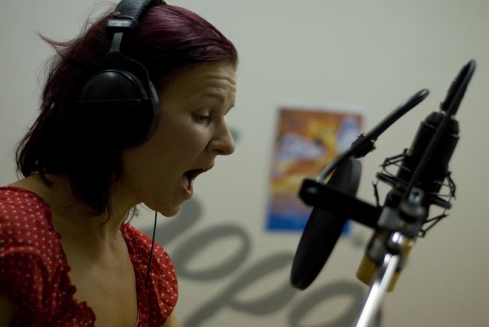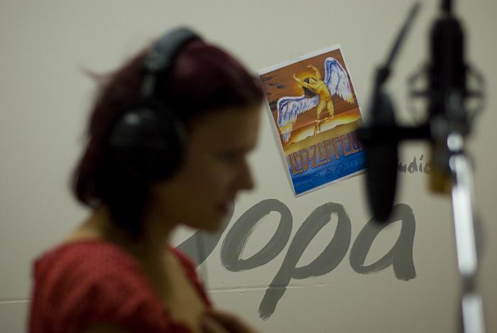 Samozřejmě zásluhou malířské skupiny Dark Gamballe je nyní příprava na nahrávání malinko složitější a zdlouhavější. Zuzka to ovšem zvládla na výbornou. Kromě hezky nazpívaných stop a vznikly i hezké fotky před plakátem u zdi.