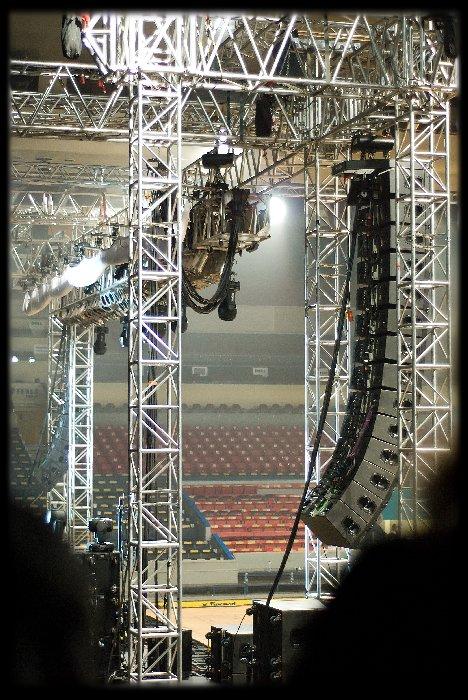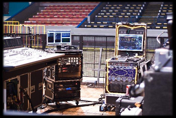 Mix je přehledný a stačí opravdu jen malá zkušenost s nějakým "digitálem" a ve vteřině víte co a jak (mluvíme samozřejmě o základním ovládání). To, že mix má na každé šavli EQ, kompresor a gate nemusím ani psát, je to již téměř samozřejmost všech digitálních pultů. Mix krmil LINE ARAY systém d&b. Jaký byl výkon tohoto systému je těžko říct. V každém případě byl výkon naprosto dostačující. Jen mě pomalu u těchto systémů začíná vadit jejich směrovost. Před bednou vám to odstřelí hlavu, uprostřed systému vám basy vyrvou játra (nebo jiné vnitřnosti)...... ani u mixu není ideální pozice pro poslech (byť je mix postaven mírně excentricky). Typy mikrofonů po mě nechtějte vědět, osobně se mě líbily jen Shure SM58, které byly na zpěvech a kupodivu mikrofony u šlapáků. Se smutnýma očima čekám na dobu, kdy se přestanou používat kondenzátorové mikromikrofony na tomy, protože to je opravdu neštěstí :-(