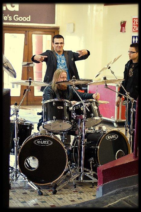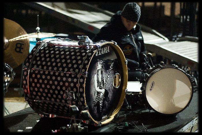 Šéf (?) zvuku ovšem pokračoval: zvučení bude probíhat 5s jednotlivé bubínky, 15s daný nástroj a zpěvy, pak 3x zahrajete 15s úsek všichni, domluva co a jak, pak to ještě jednou zopakujete (těch 15s) a je to nazvučené. Víc pro 15 minut slávy neuděláme. Jak řekl, tak bylo (opravdu jim všechno časově sedělo, tomu věřte). Suma sumárum zvuková zkouška trvala 4 - 5 minut.