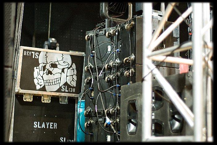 Na místo náš túrbas VW LT RV 99 (poznámka Šimka) přijel podle plánu a to o půl hodiny později. Pódium (stejč) bylo již v plné parádě a chvíli na to se začali nosit na pódium všechny aparáty (!) všech (!) zúčastněných kapel. Pódium (stejč), které se ještě do té chvilky jevilo prostorově jako uspokojivé pro ostravskou mlátičku bylo najednou plné nepotřebných harampádí. Zajisté si dovedete představit pódiové aparáty 4 kapel (normálních) a pódiový aparát Slayer který čítal bicí, 36 kytarových Marshall boxů a dva obrovské baskytarové boxy téže značky. Místa na pódiu (stejdži) moc věru nezbylo. Nejvíce nešťastný z prostoru byl pan Šimek (toho času mistr světa), bo si sehnal vysílačku, koupil si devět voltů na benzínce za 159,-Kč (v akci) a nic. Sám uznal, že kabel je kabel. Ale to jsem předběhl jednu maličkost....