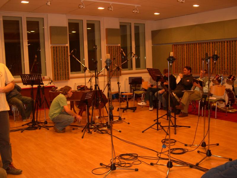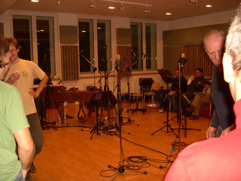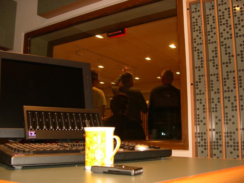 Přesně tak jak je to v té písničce. Veličanů doma néni, jéli do ... studia do Veselá točit cédé. Dnešním odpolednem začalo nahrávání mužského pěveckého sboru z Velké nad Veličkou. Dnes se točilo za doprovodu cimbálové muziky Petra Mičky. CD bude pěkné, provede nás Horňáckým rokem v celé své kráse. Mezi členy sboru se objevily i horňácké "folklórní star" (mezi jinými např. pan Kučera, kterého jistě znáte z nahrávky kapely Sad Harmony - Ode mlýna ke mlýnu). 17-ti členný sbor je opravdu mohutný a kdo znáte aspoň trochu Horňácké písničky, dokážete si představit tu neuvěřitelnou hmotu. Jinak zima začala ve své plné parádě. Bylo to hned poznat. Po chodbách se krásně nesla ta vůně svařeného vína (na hlasivky). Zítra pokračujeme a snad se mě podaří nafotit sbor kompletně.