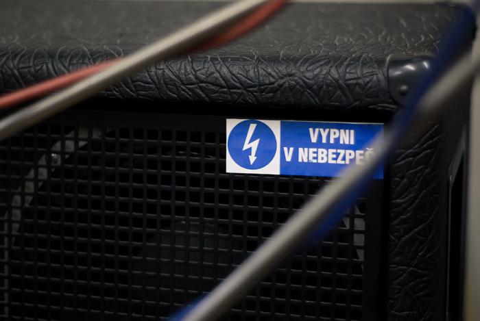 Konečně po těch různým Boogie, Marshall, Engl, HardBox, Vlasa, Peavey kytarových boxech se ve studiu ukázalo konečně něco nového. Ano, tou novinkou je kytarový box "VYPNI V NEBEZPEČÍ". Jedná se o ryze českou výrobu. Box je osazen čtyřmi 12" reproduktory a nejsou to V30-ky!. Další výhodou boxu je bezesporu logo. Český výrobce myslel na podprůměrné evropské výdělky. V případě poškození loga už nemusíte objednávat ze Spokojených států (jak říká můj kamarád Petr Kolacia) levně vyrobenou drahou desku s logem jakýchsi inženýrů, ale stačí zajít do prodejny pracovních pomůcek a tam běžně logo VYPNI V NEBEZPEČÍ koupíte. Za hubičku skoro.